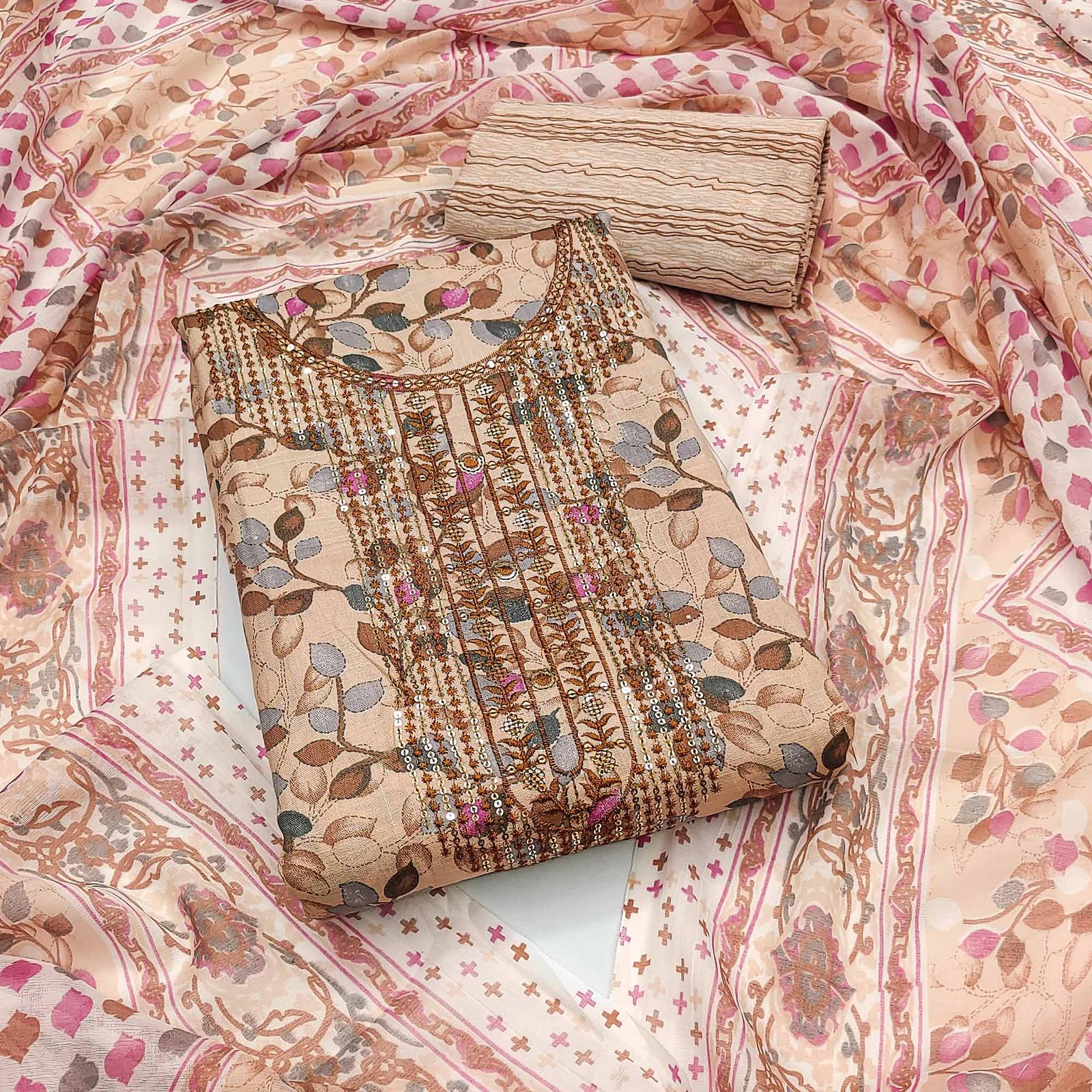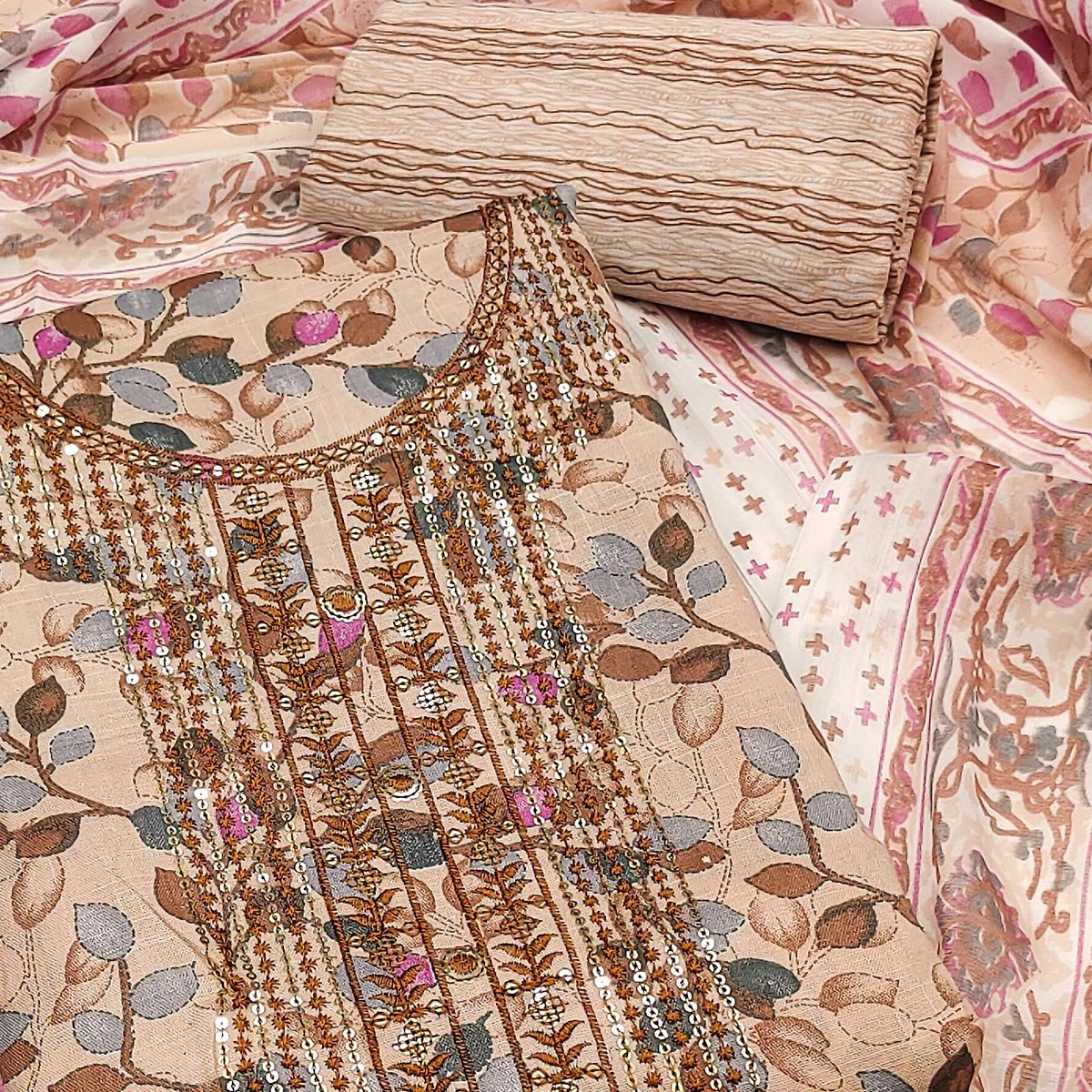 Beige colored suit is prettified with floral printed with sequins embroidery work as shown which makes it appear classy. This top is made of pure cotton fabric which is accompanied with pure cotton bottom and printed pure cotton dupatta. Women can buy this suit to wear for their casual and daily wear. Note:- The actual product may differ slightly in color and design from the one illustrated in the images when compared with computer or mobile screen.